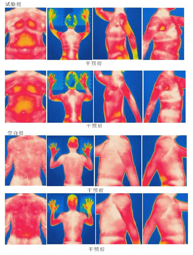 招募32名健康受试者随机分为试验组15例和空白组17例,受试者进入检测室静待5分钟后,采集其正面、背面、左右侧面的红外热图;