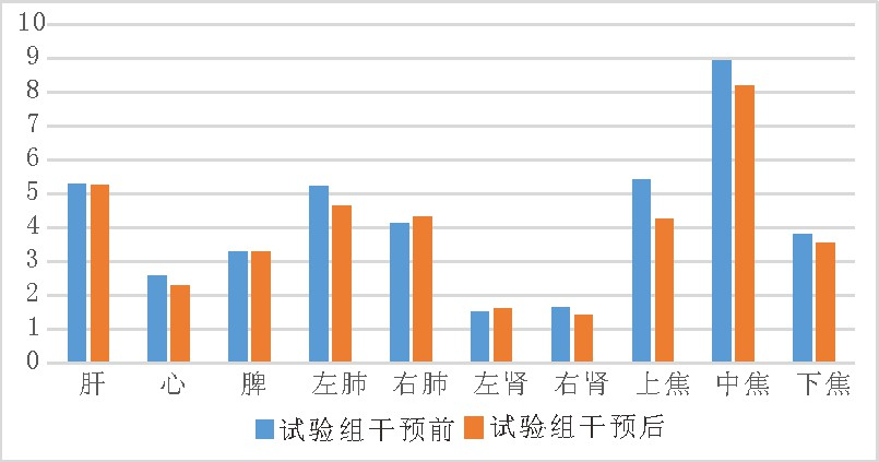 试验组与空白组相比,干预前,两组脏腑温度极差无统计学差异,干预后,两组相比,上中下三焦脏腑温度极差存在统计学差异,其他脏腑温度极差无明显统计学差异。